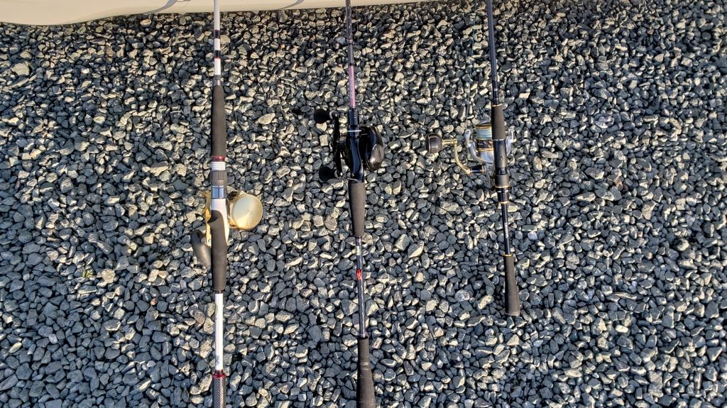 ボートに持ち込んだタックルは、左からライトゲームCI4モデラート+オシアコンクエスト300PG(サビキ)、紅牙X+炎月100PG(タイラバ)、ソルティストBS+ストラディックSW(キャスティング)の3本。