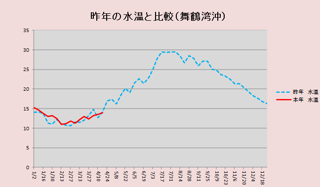 コンスタントに16〜17℃を超えてくると魚が活性化し、キス・アジ・アオリイカのシーズンが始まるという感じです。