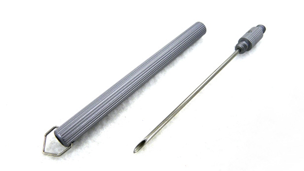これはねじ込み式のエアー抜きで、ウキブクロが膨れ上がった魚の側面にブスと刺すとプシュとエアーが抜けてウキブクロが縮み、魚が海底に戻ることが可能になります。