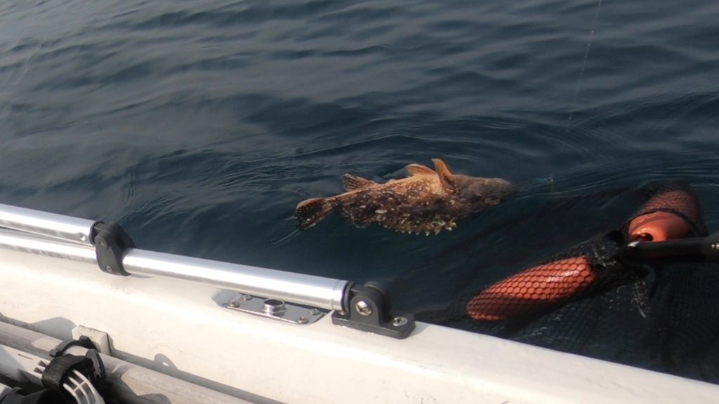 持って帰らない小さい魚、特に根魚は大きくなるのに時間が掛かるので、釣っても海に帰すことが多いのですが、水深30メートルより深いところから巻き上げてくると、水圧の関係でウキブクロ(胃?)が口から飛び出てしまい海に戻れなくなってしまいます。