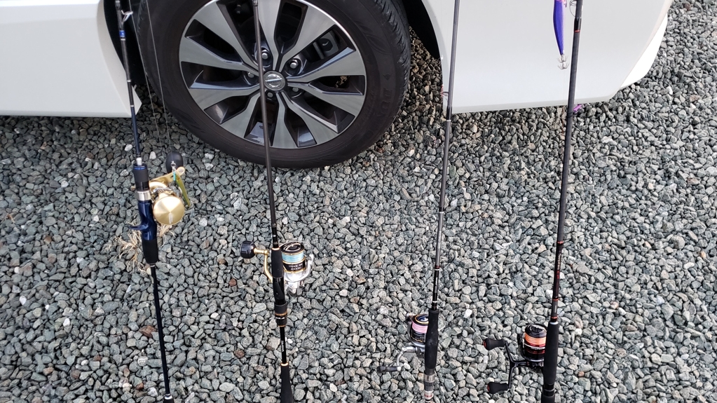 左からスロージギング用グラップラー+オシコン、ジグキャスト用ソルティストBS+ストラディックSW、キス用KISU BB+ナスキー、ティップラン用セフィア+セフィアCI4の4本です。