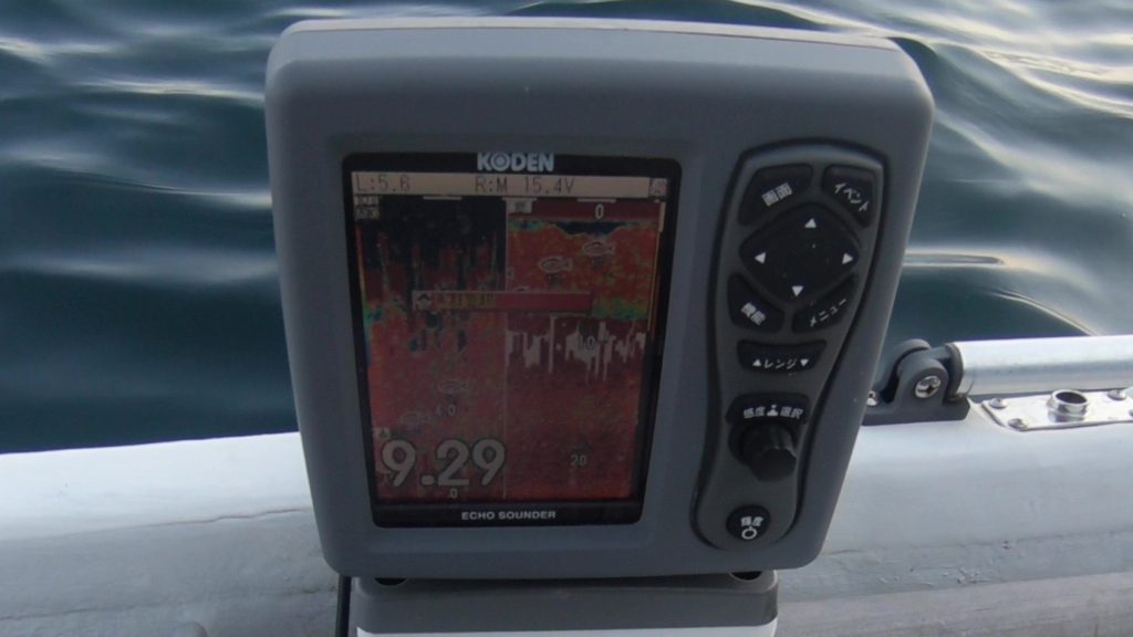 しばらく走って、湾外出てすぐ右手の岩場で、魚探が真っ赤になる反応が。