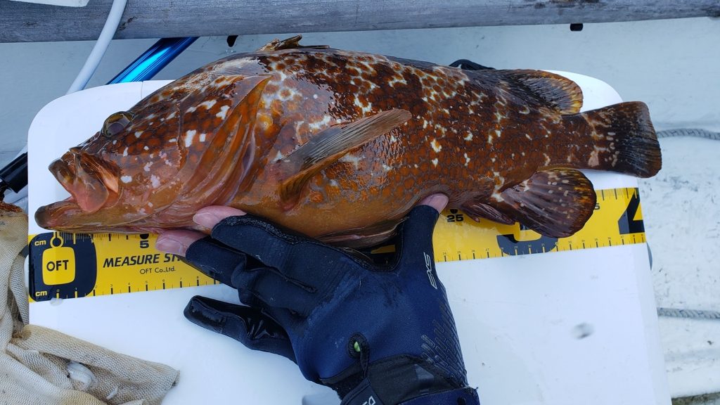 最初重くてドラッグがジージー出たので、すかさず締めて無理矢理底から引き剥がすとスルスルと上がってきたのであー、ガシラかと思って見たら良型のアコウ。(キジハタ)