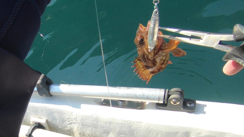 何度かキャスティングしていたら、フックにイワシが刺さっていたので、そのまま下に落としたらカサゴが食いついたので、水深10メートルないところでしたが、TGベイト80gが付いたままのスロジギ用タックルに変更。