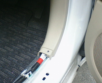 常時電源とドアロック信号は、足下のコネクタから取ります。そのため、足下のガーニッシュを2カ所取り外します。