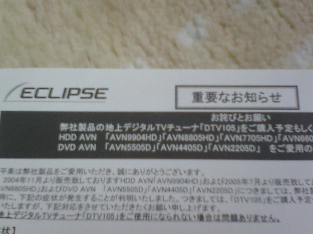 いやー、イクリプスの’05モデルはトラブルばっかり満載ですね。DTV105というデジタル地上波チューナーに関するアナウンスなのですが、それ以上に改善して欲しいのがアナログTVの映りの悪さです。