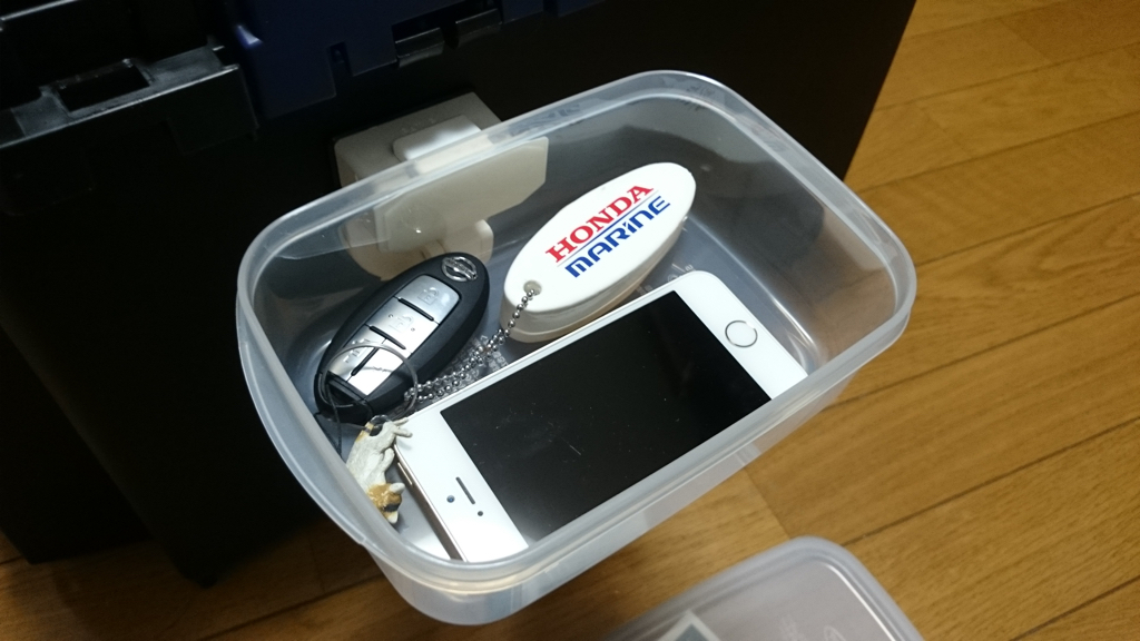 もともと汁物がこぼれない蓋付きタッパーなので、少々波をかぶったところで問題はなく、写真に写っているiPhone5sや車のキーレスエントリーも安心して収納できます。