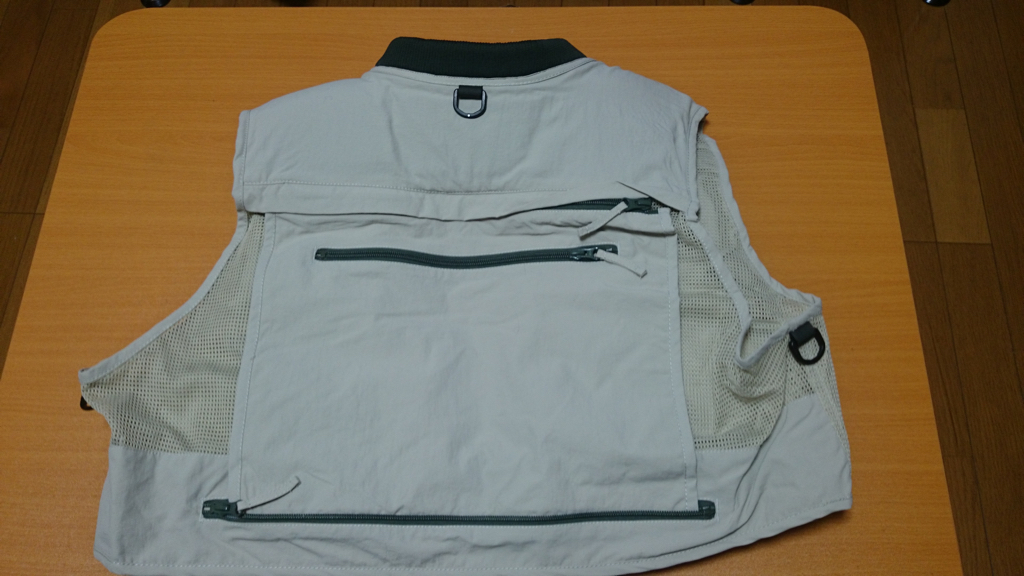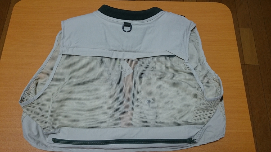 前身頃はメッシュの上に多数のポケットが備え付けられており、背中の部分はロールタイプで暑い時期には全開にできます。