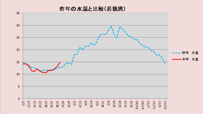去年はゴールデンウィーク明けにようやく15℃を超えていたのが、今年は一ヶ月も早い4月4日の時点で早くも15℃に到達しており、いよいよスモールボート釣りもシーズンインといったところでしょうか。