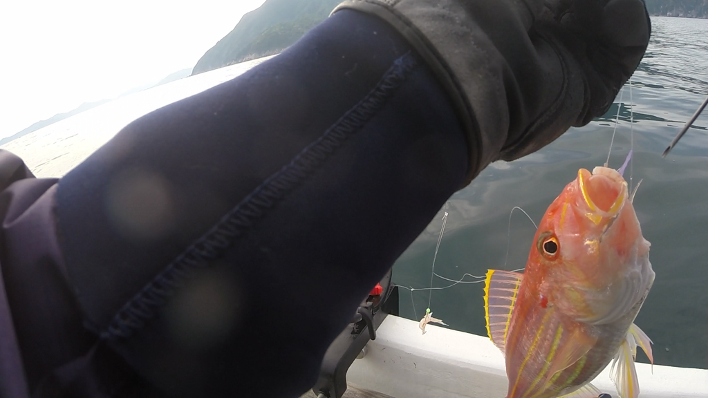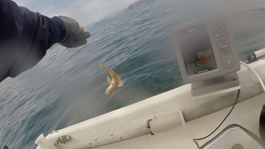 その後もアジを求めて湾外〜湾内を彷徨っていたのですが、まだちょっと早かったようで、いつものキジハタ・カサゴ・ベラに加えエソという具合で持ち帰りはイトヨリ1尾のみというちょっと寂しい結果に終わりました。