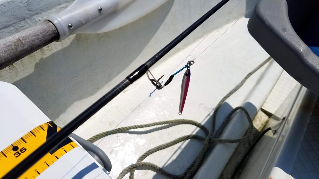 魚探が使えないので、魚がいるのかどうかわからない状況の中、ここでスロージギングをやってみました。