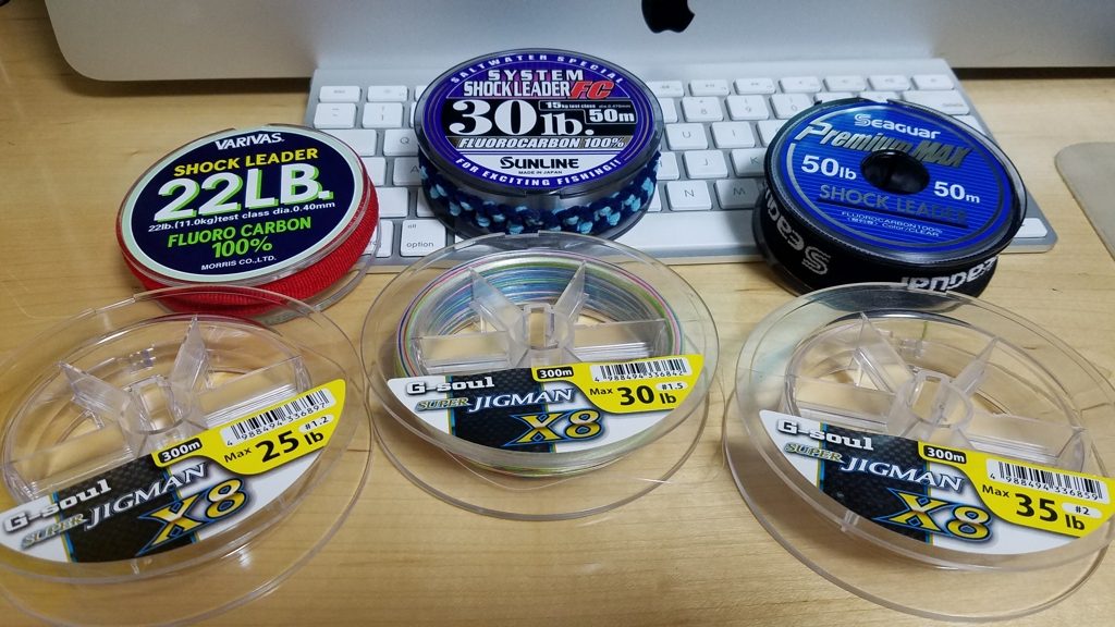 25lb(PE1.2号)ラインには22lb、30lb(PE1.5号)ラインには30lb、35lb(PE2.0号)には50lbのフロロリーダーを結んでいます。