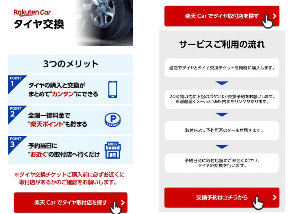 手順は、楽天市場で、タイヤと交換チケットを対応ショップで購入し、予め検索しておいた近所の交換ショップを選択(3軒まで選択可能)してWEBで交換希望日を予約という流れになります。