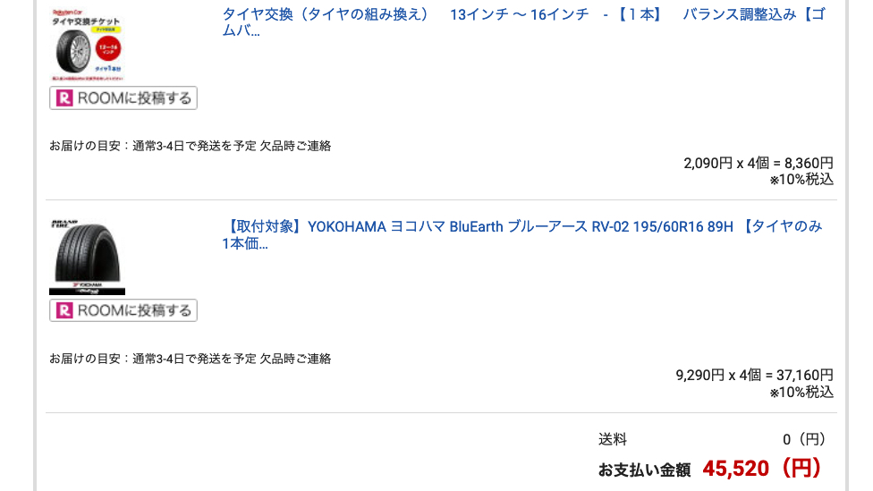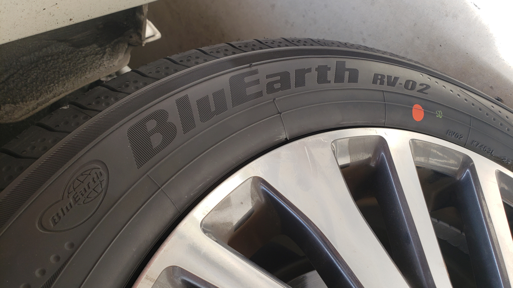 購入したタイヤは、ヨコハマのブルーアース RV-02というタイヤで4本で37,160円、交換費用も4本で8,360円、これに廃タイヤの処分費用330円〜550円×4本分をプラスして47,720円(廃タイヤ処分費550円/本と仮定、税込)と、ディーラーで交換するよりも37,000円以上もお得になります。(エアバルブ交換でもうちょっと追加になるかも)