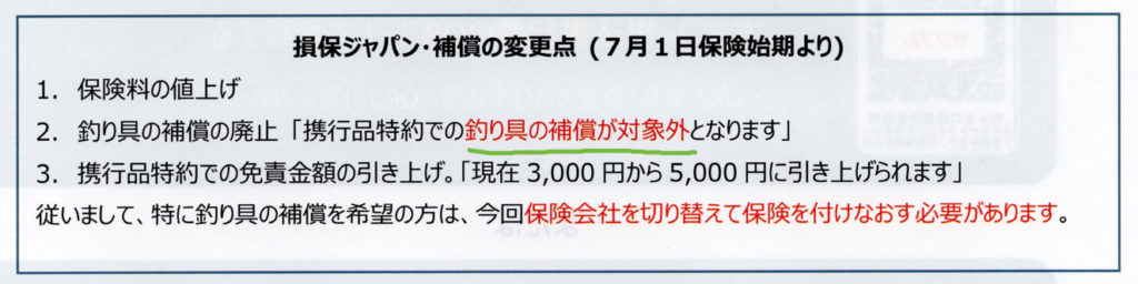 で、お知らせに「釣り具の補償を希望の方は、今回保険会社を切り替えて保険を付けなおす必要があります。」とあり、新しい保険の申込書が同封されていました。